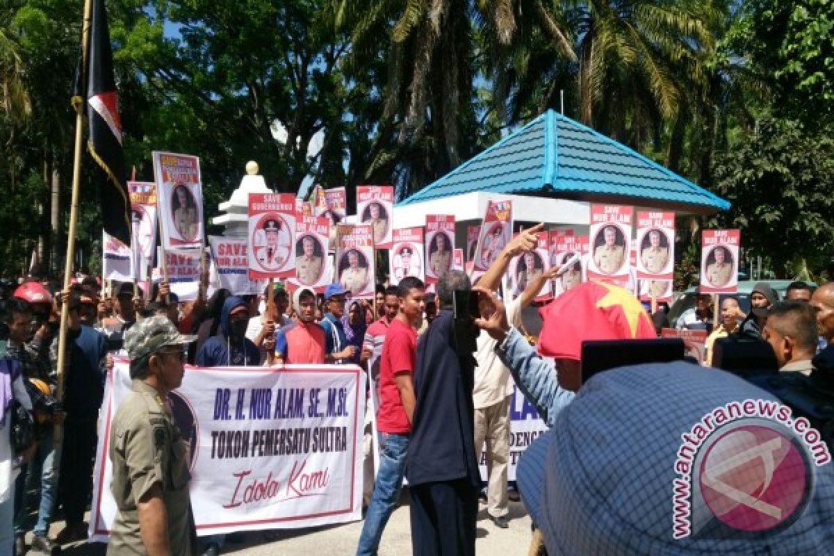 Ribuan mssa yang tergabung dalam "Konsorsium Rakyat Sulawesi Tenggara" menyampaikan aspirasi di Gedung DPRD dan Pengadilan Tinggi Sulawesi Tenggara. Aksi empati ribuan orang yang terdiri dari laki-laki dan perempuan itu dalam pengawalan dari aparat kepolisian setempat. Kapolres Kendari AKBP Sigit Hariyadi mengimbau warga negara dalam menyampaikan aspirasi menjunjung tinggi norma hukum yang berlaku. "Kepolisian berkomitmen mengamankan, melayani dan mengayomi setiap warga negara yang menyampaikan aspirasi sesuai koridor hukum yang berlaku," kata Kapolres Sigit. Gubernur Sultra Nur Alam ditetapkan sebagai tersangka tindak pidana korupsi oleh Komisi Pemberantasan Korupsi (KPK) atas tuduhan penyalahgunaan wewenang menerbitkan izin usaha pertambangan (IUP).