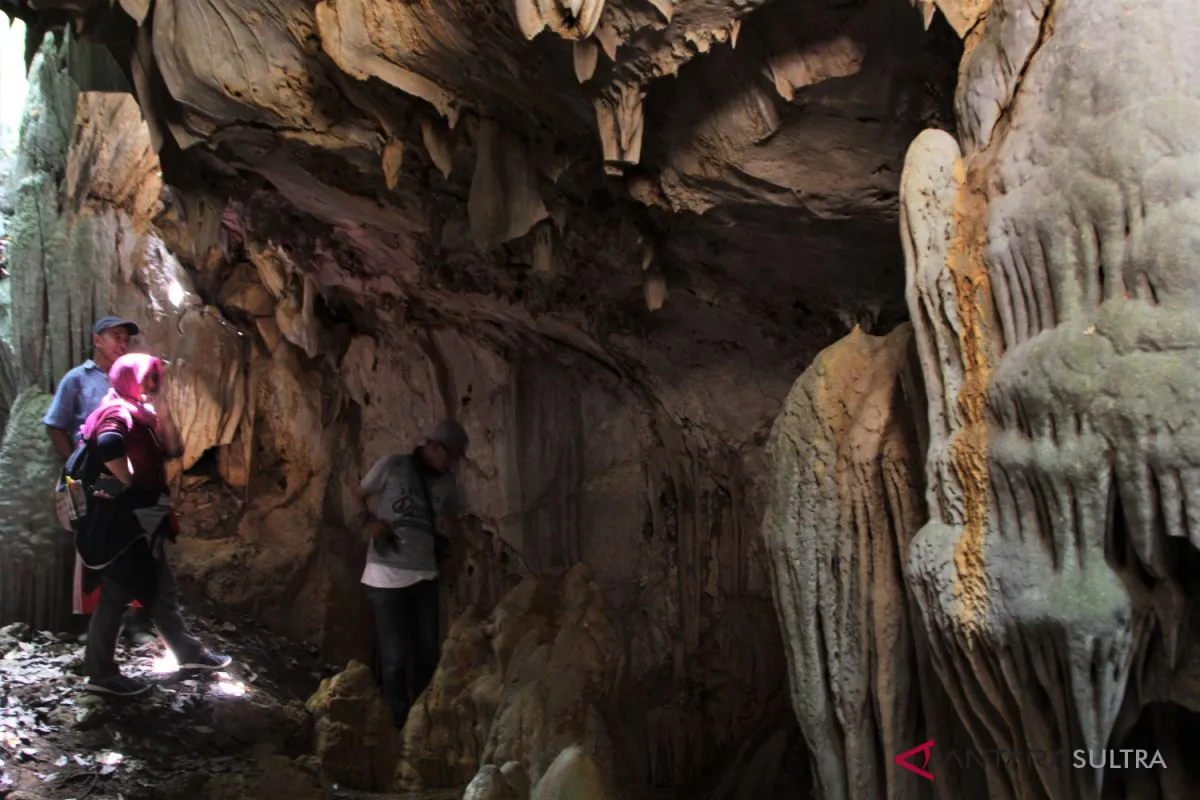 Saleh berusia 60 tahun berada di gua yang baru diketemukannya bersama pegawai Dinas Pariwisata Konawe di Desa Telaga Biru, Konawe, Sulawesi Tenggara, Minggu (30/9). Gua eksotis memiliki stalagmit yang sangat indah dan didalamnya terdapat danau dengan air berwarna biru dan rencananya pemerintah setempat akan menjadikan lokasi destinasi wisata. ANTARA FOTO/Jojon/18.