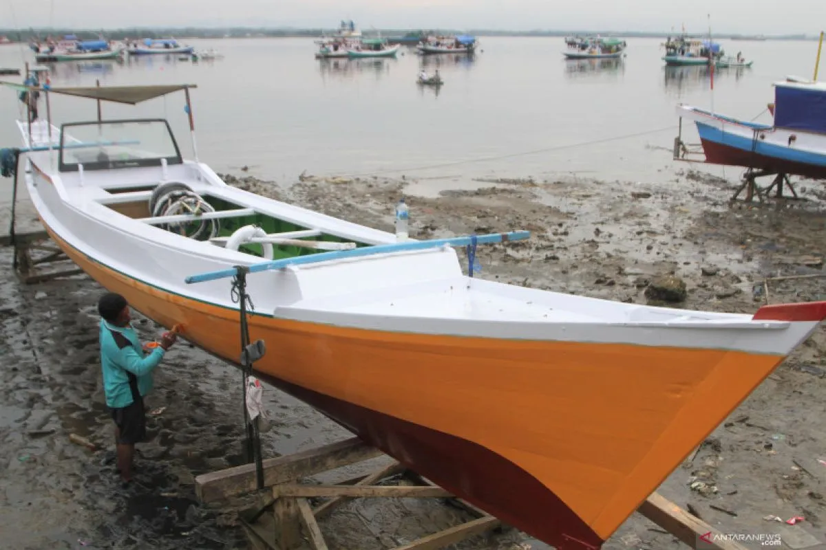 Seorang pekerja menyelesaikan pengecatan perahu nelayan di Teluk Kendari, Kendari, Sulawesi Tenggara, Rabu (17/7/2019). Proses pengecatan perahu membutuhkan waktu sekitar tiga sampai tujuh hari dengan jasa tarif pengecatan bervariasi mulai dari ratusan ribu hingga jutaan rupiah tergantung ukuran kecil dan besarnya perahu. ANTARA FOTO/Jojon/19.