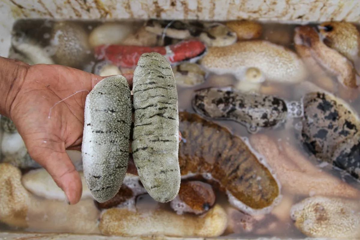 Tengkulak menunjukan teripang yang dibeli dari nelayan Suku Bajo di Desa Bajo Indah, Konawe, Sulawesi Tenggara, Sabtu (14/12/2019). Harga teripang atau trepang dengan harga dapat mencapai Rp1 juta per kilogramnya membuat para nelayan Suku Bajo di Kecamatan Soropia Kabupaten Konawe terus mencarinya di sekitar Pulau Bokori saat surut air.