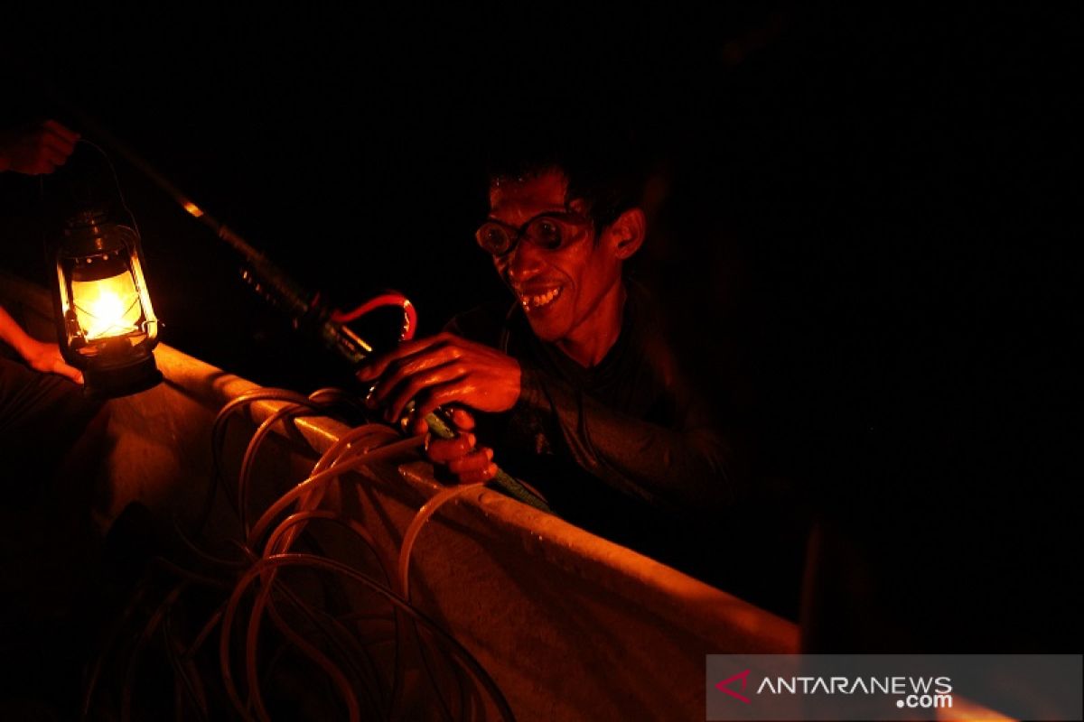 Seorang Suku Bajo bersama anaknya bersiap memanah ikan dengan alat bantu kompresor untuk membantu pernafasan di sekitar Pulau Bokori, Kecamatan Soropia, Konawe, Sulawesi Tenggara, Selasa (4/8/2020). Beberapa tahun terakhir Suku Bajo yang menggantungkan hidup pada jasa pengantaran wisatawan ke Pulau Bokori itu kembali menangkap ikan setelah wisata itu ditutup akibat rencana pemerintah setempat memberikan pengelolaan wisata itu ke investor asing. (ANTARA FOTO/JOJON)