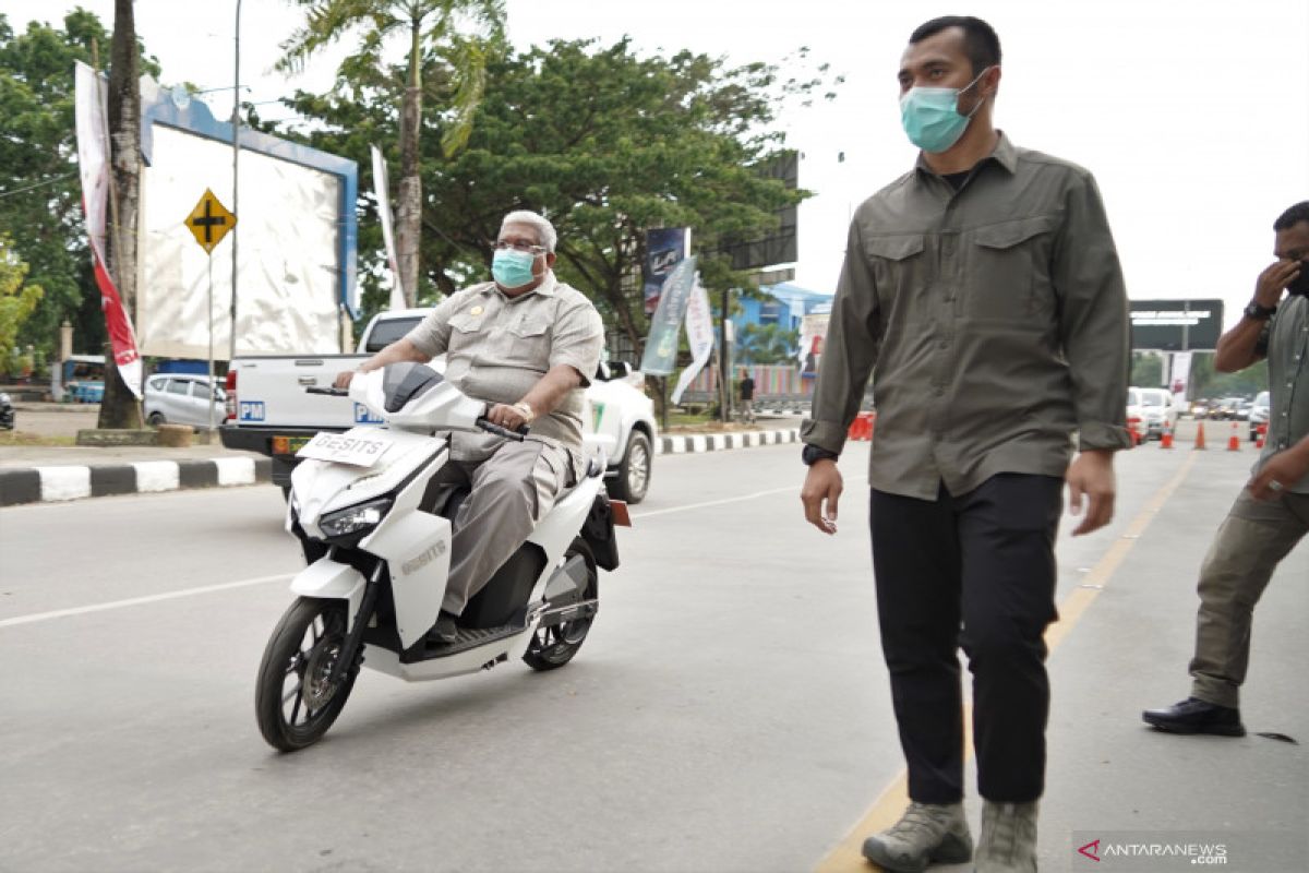 Gubernur Sulawesi Tenggara Ali Mazi (kiri) berada diatas sepeda motor listrik merk GESITS saat peluncuran perdana di MTQ Square di Kendari, Sulawesi Tenggara, Sabtu (27/2/2021). PT WIKA Industri Manufaktur (WIMA) melaunching sepeda motor listrik bernama GESITS di Kendari dan kendaraan ini buatan putra-putri bangsa Indonesia.