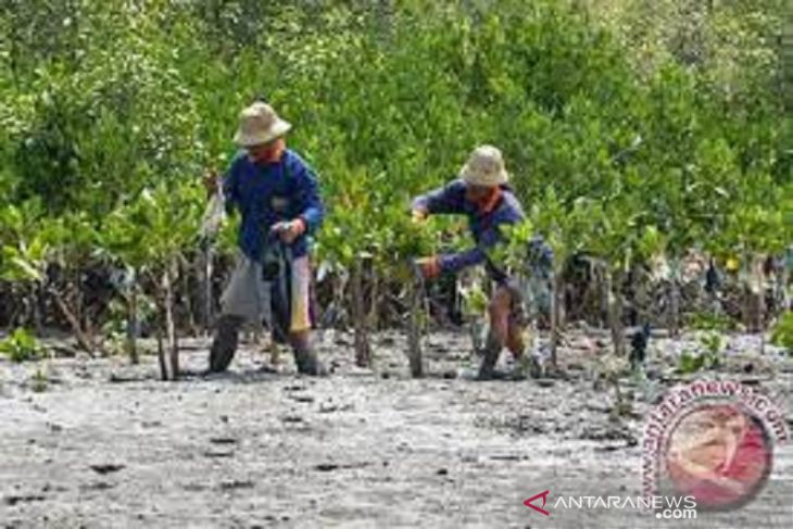 Petugas Balai pengelola daerah aliran sungai dan hutang lindung Kendari saat melakukan penanaman mangrove di kawasan pantai di Muna.(Foto ANTARA)