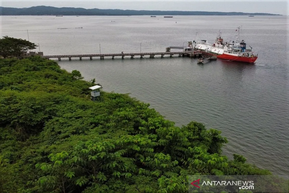 Foto udara aktivitas bongkar muat kapal tanker di Stasiun Pengisian dan Pengangkutan Elpiji Khusus (SPPEK) di Kelurahan Sambuli, Kendari, Sulawesi Tenggara, Selasa (4/1/2022). Stasiun Pengisian dan Pengangkutan Elpiji Khusus (SPPEK) PT Karunia Harapan Sejati menyupai kebutuhan LPG PSO maupun NPSO di Kendari dan Sulawesi Tenggara daratan.