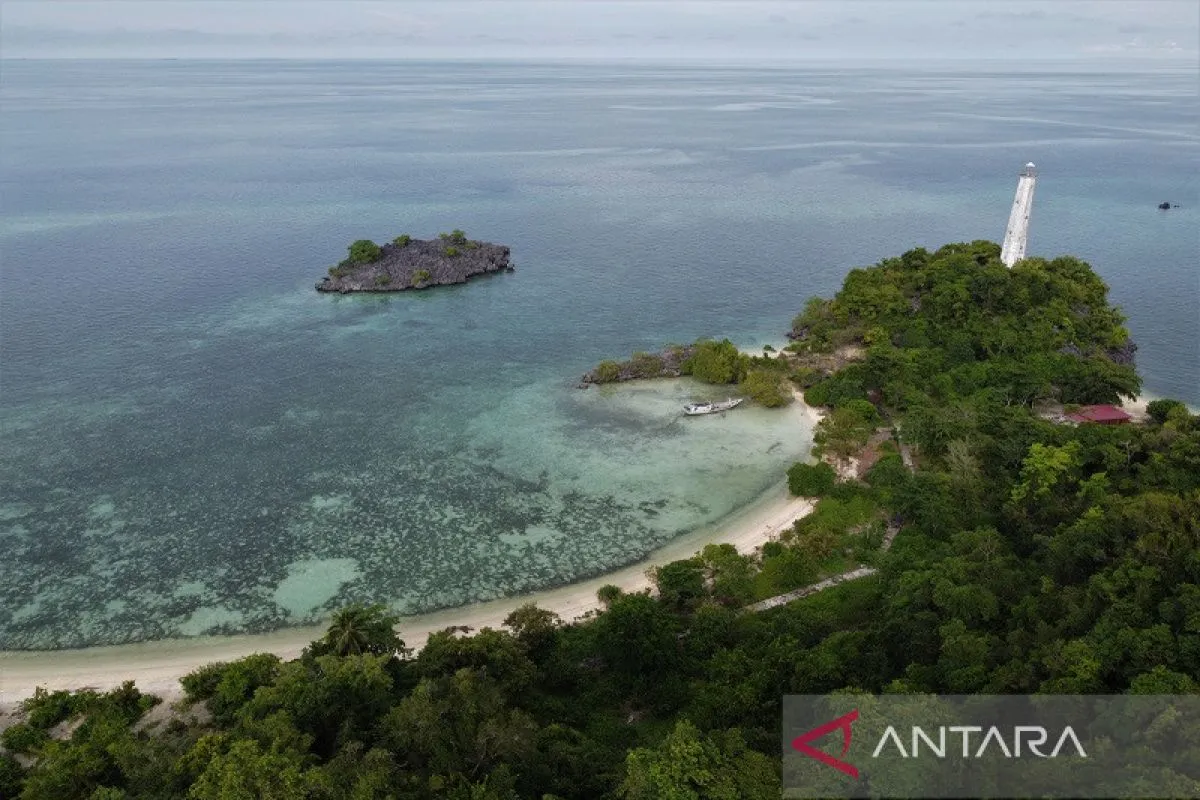 Foto udara bangunan mercusuar peninggalan Belanda di Pulau Labengki, Konawe Utara, Sulawesi Tenggara, Selasa (15/3/2022). Pulau Labengki menjadi salah satu destinasi unggulan Sulawesi Tenggara karena panorama 5alam yang cukup eksotis juga terdapat mercusuar peninggalan belanda menjadi salah satu spot favorit bagi wisatawan yang berkunjung. ANTARA FOTO/Jojon.ANTARA FOTO/JOJON (ANTARA FOTO/JOJON)