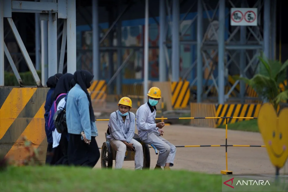 Dua karyawan bersantai diwaktu istirahat disalah satu perusahaan smelter nikel di Kecamatan Morosi, Konawe, Sulawesi Tenggara, Sabtu (26/11/2022). Kantor BPJS Ketenagakerjaan Cabang Kendari mencatat realisasi hingga Novemver 2022 jumlah karyawan lokal di dua perusahaan smelter nikel di Konawe yang telah menjadi peserta BPJS Ketenagakerjaan Program Jaminan Kehilangan Pekerjaan (JKP) sebanyak PT Obsidian Stainless Steel (OSS) 15.673 orang peserta dan PT Virtue Dragon Nickel Industry (VDNI) 7.670 orang peserta. ANTARA FOTO/Jojon.