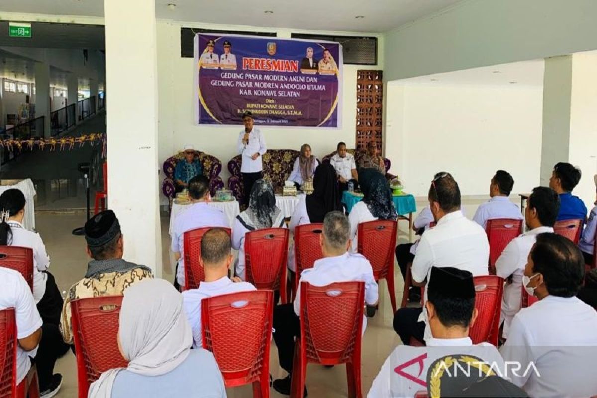 Kendari (ANTARA) - Dua pasar moderen di Kabupaten Konawe Selatan, Provinsi Sulawesi Tenggara (Sultra) yaitu Pasar Akuni dan Pasar Andoolo Utama (DU) resmi difungsikan sebagai bentuk perhatian dalam meningkatkan perekonomian masyarakat di daerah itu.