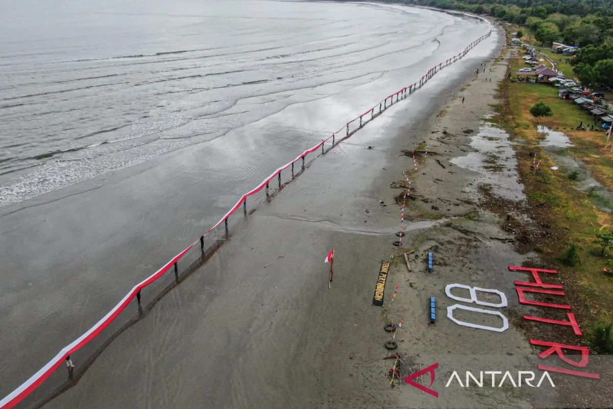 Kendari (ANTARA) - Warga Kabupaten Konawe bersama mahasiswa Universitas Muhammadiyah Kendari (UMK) membentangkan bendera merah putih sepanjang 580 meter di Pantai Tanjung Lalimbue, Kecamatan Kapioala, Kabupaten Konawe, Provinsi Sulawesi Tenggara (Sultra), dalam rangka merayakan HUT Kemerdekaan ke-80 RI.