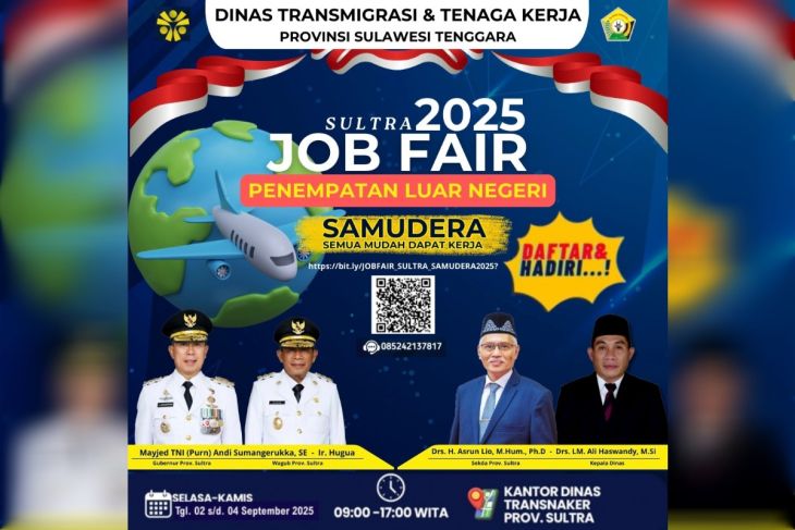 Kadis Nakertrans Sultra H.LM Ali Haswandy di Kendari, Senin mengatakan, di tahun ini Disnakertrans Sultra bekerjasama dengan Balai Pelatihan Perlindungan Pekerja Imigran Indonesia (BP3MI) Sultra menyelenggarakan bursa kerja yang akan dibuka mulai tanggal 2-4 September 2025 dengan pusat kegiatan job fair di aula Kantor Disnakertrans Provinsi Sultra.