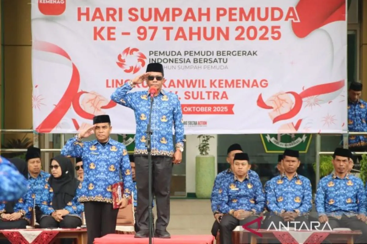 Kendari (ANTARA) - Kakanwil Kemenag Provinsi Sulawesi Tenggara, H. Muhamad Saleh memimpin upacara peringatan Hari Sumpah Pemuda ke-97 Tahun 2025 di lingkungan Kanwil Kemenag Sultra bertempat di pelataran Kanwil Kemenag Sultra. di Kendari, Selasa.