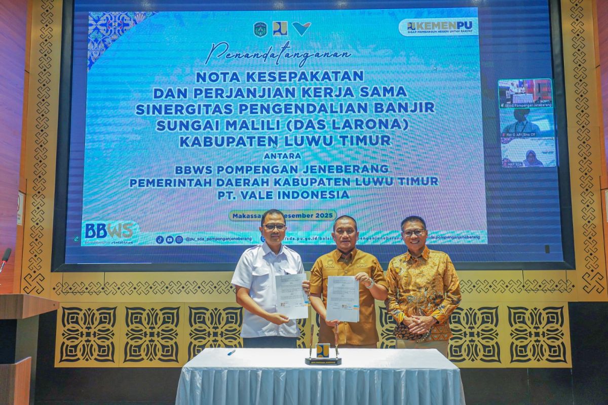 Penandatanganan ini turut dilakukan oleh Wakil Presiden Direktur PT Vale Indonesia Abu Ashar dan Kepala BBWS Pompengan Jeneberang Heriantono Waluyadi.