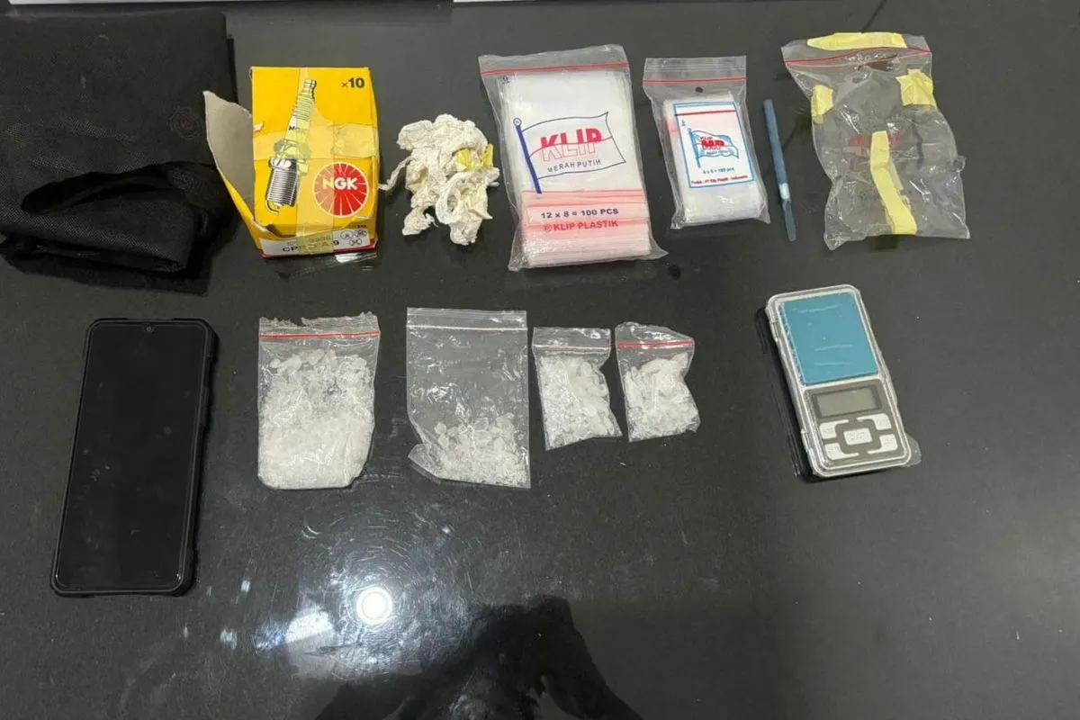 "Barang bukti yang disita antara lain satu unit telepon genggam, satu timbangan digital, puluhan bungkus plastik kosong berbagai ukuran, sendok sabu dari pipet, tisu, serta kotak pembungkus busi yang diduga digunakan dalam aktivitas peredaran narkotika," lanjutnya.